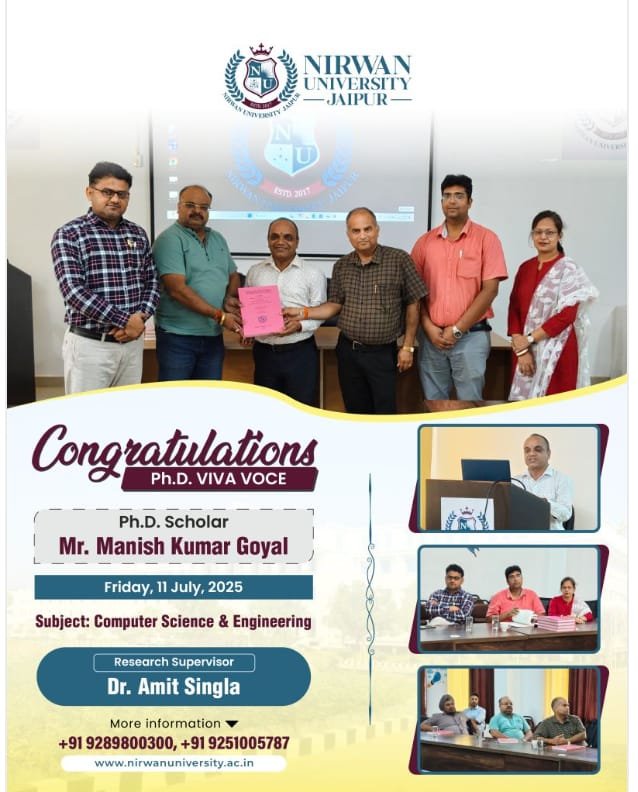 जयपुर। निर्वाण यूनिवर्सिटी जयपुर की ओर से मनीष कुमार गोयल को पीएचडी की उपाधि प्रदान की गई है। मनीष ने कम्प्यूटर साइंस एंड इंजीनियरिंग विभाग में डाॅ. अमित सिंगला के सुपरविजन में अपना शोध ए स्टडी आन डाटा माइनिंग मेथडस टू मेक प्रीडिक्षनस फाॅर स्टूडेंटस बाय यूसिंग हाइयर एजुकेशन सिस्टम पर पूर्ण किया है। डाॅ. मनीष वर्तमान में जयपुर के निजी विष्वविद्यालय में अपनी सेवाएं दे रहे है।