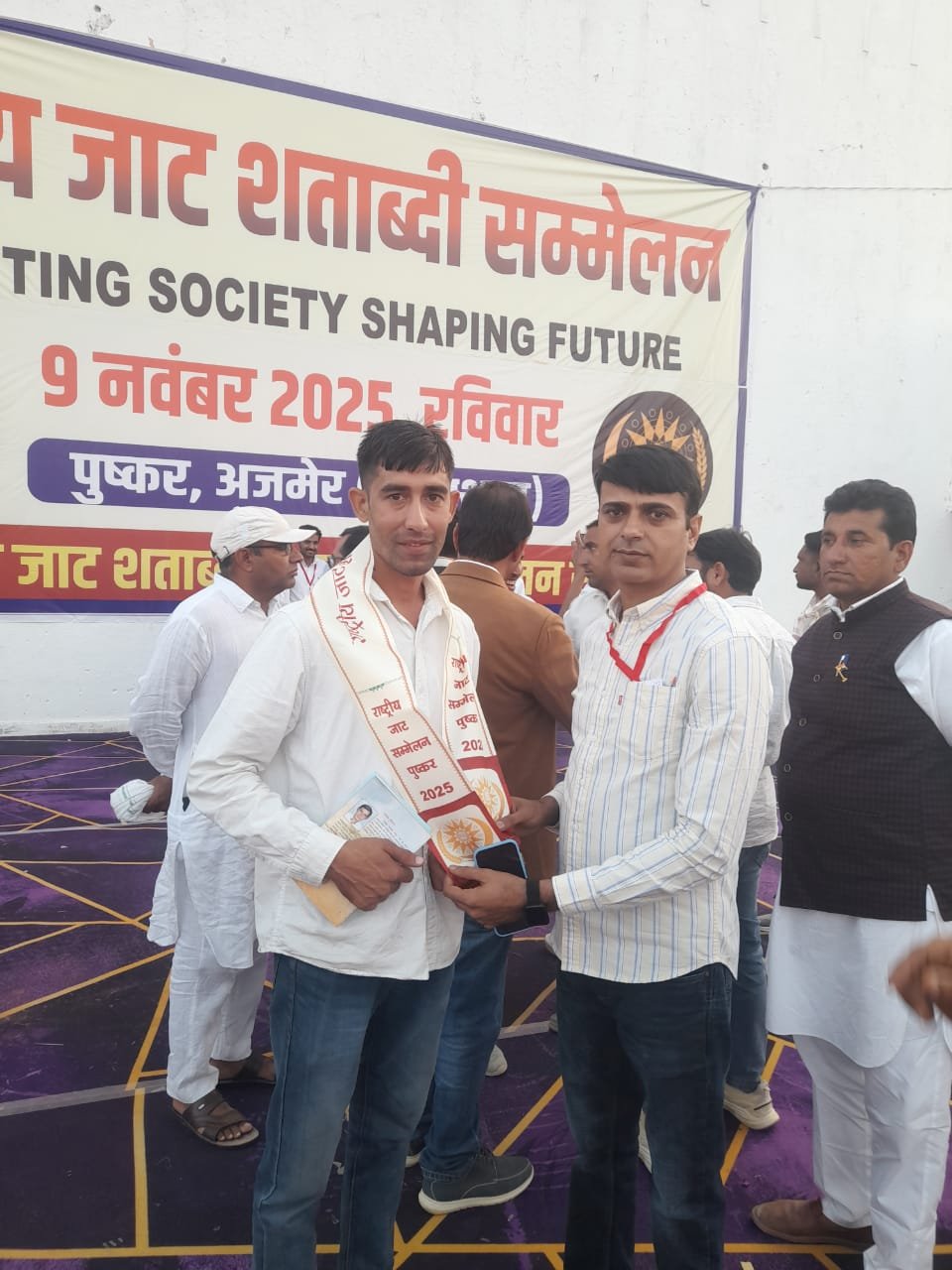 पुष्कर। राष्ट्रीय जाट शताब्दी समारोह 2025 के भव्य आयोजन में पत्रकार हरीराम रेवाड़ को सम्मानित किया गया। जाट विश्राम स्थली में आयोजित इस समारोह में जाट समाज के कई बड़े नेता और समाजसेवी उपस्थित थे। हरीराम का सम्मान आयोजन समिति के सदस्य प्रेम सिंह सियाग ने किया। इस अवसर पर हरीराम ने कहा कि सम्मान से एक ऊर्जा का संचार हुआ है और आयोजन समिति का आभार व्यक्त किया। हरीराम रेवाड़ मकराना तहसील के गांव दाबडिया के रहने वाले हैं, जिनके पिताजी एक किसान हैं। हरीराम जयपुर में एक दैनिक समाचार पत्र में कार्यरत हैं और अपनी पत्रकारिता के माध्यम से समाज की सेवा कर रहे हैं। समारोह में समाज में फैली हुई कुरीतियों को मिटने की बात कही गई। जाट समाज के नेताओं ने समाज को एकजुट होकर आगे बढ़ने का आह्वान किया। समारोह में उपस्थित लोगों ने जाट समाज की एकता और गौरव को प्रदर्शित किया।