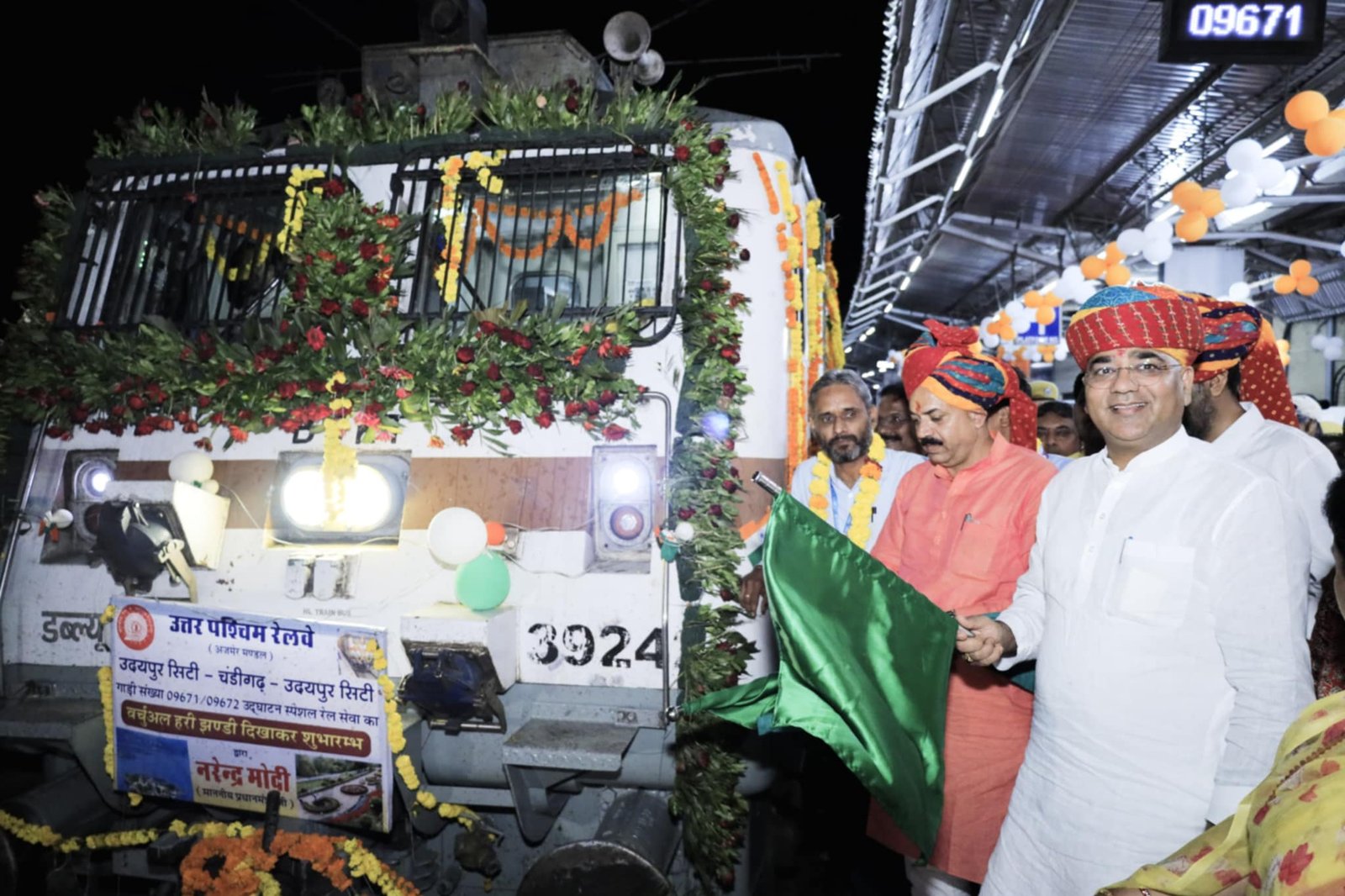 जयपुर, 26 सितम्बर।  प्रधानमंत्री श्री नरेन्द्र मोदी जी ने गुरूवार को उत्तर पश्चिम रेलवे (अजमेर मंडल) की नई रेल सुविधा उदयपुर सिटी–चंडीगढ़–उदयपुर सिटी (गाड़ी संख्या 09671/09672) स्पेशल रेल सेवा का बांसवाड़ा जिले में आयोजित कार्यक्रम में वर्चुअल शुभारंभ किया। इसके उपरांत इस विशेष रेल को अजमेर रेलवे स्टेशन से जल संसाधन मंत्री  श्री सुरेश सिंह रावत ने हरी झंडी दिखाकर रवाना किया।