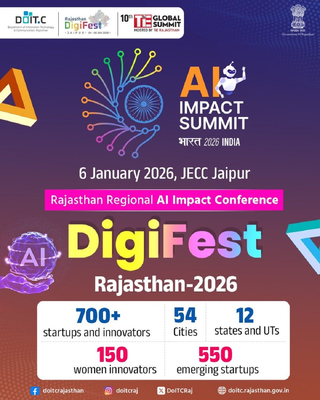 जयपुर, 29 दिसंबर। राजस्थान सरकार के सूचना प्रौद्योगिकी और संचार विभाग और टाई राजस्थान के सहयोग से ‘राजस्थान डिजिफेस्ट टाई ग्लोबल समिट 2026’ का भव्य आयोजन जयपुर में 4 से 6 जनवरी, 2026 तक किया जाएगा। सीतापुरा स्थित जयपुर एग्जिबिशन एवं कन्वेंशन सेंटर (जेईसीसी) में आयोजित होने वाले इस समिट के वैश्विक मंच पर स्टार्टअप्स, निवेशक, नीति निर्माता, उद्यमी और क्रिएटर्स एक साथ आएंगे, जहां प्रौद्योगिकी और सतत विकास जैसे विषयों पर चर्चा होगी। इस अवसर पर विभिन्न सत्रों और स्टार्टअप पिच के अलावा हैकाथॉन, कॉमिकॉन, फिल्म फेस्टिवल और राजस्थान रीजनल एआई इम्पेक्ट कॉन्फ्रेंस जैसे विशेष आयोजन भी होंगे।
