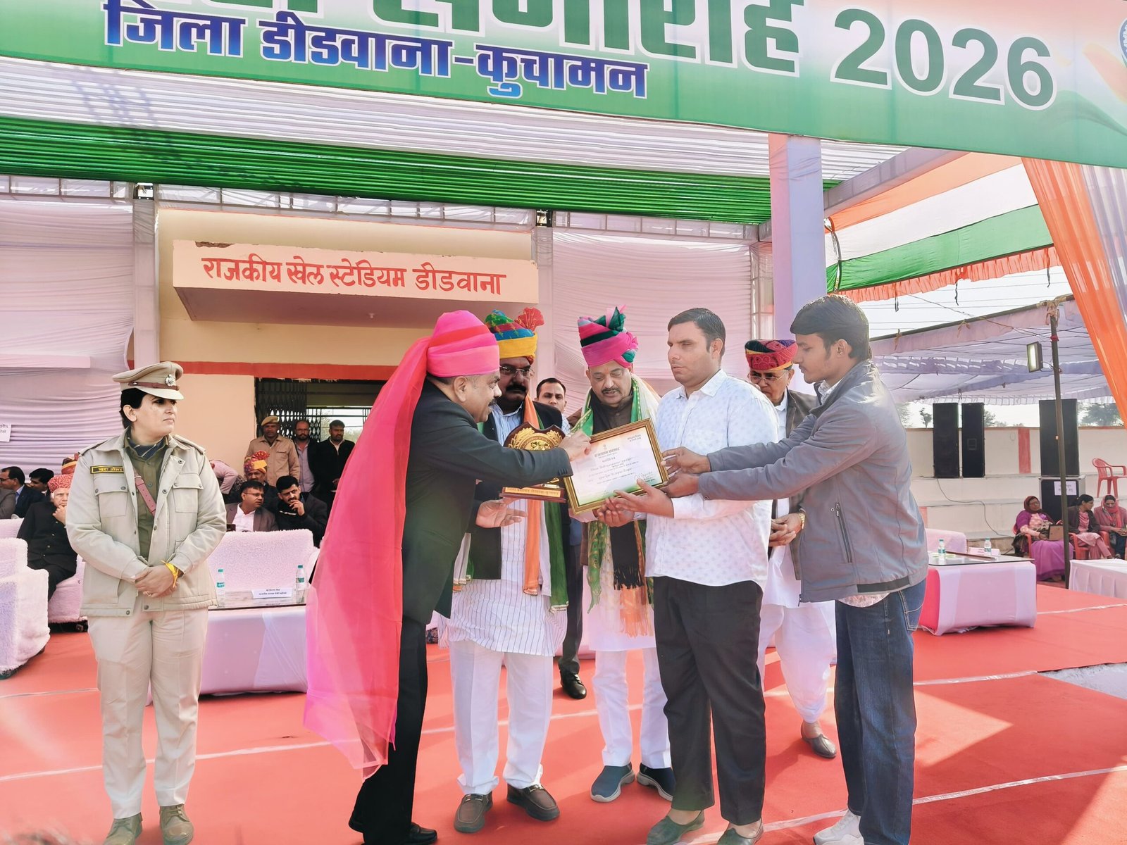 28 जनवरी, जयपुर।गणतंत्र दिवस के अवसर पर पर्यावरण संरक्षण एवं पेड़-पौधों के रखरखाव के क्षेत्र में उत्कृष्ट कार्य करने के लिए ग्राम पंचायत रामदेवरा के वार्ड पंच रामदेव खर्रा को जिला प्रशासन डीडवाना-कुचामन द्वारा सम्मानित किया गया। यह सम्मान जिला कलेक्टर महेंद्र खड्गावत एवं प्रभारी मंत्री विजय सिंह चौधरी के सान्निध्य में आयोजित जिला स्तरीय समारोह में प्रदान किया गया। रामदेव खर्रा द्वारा ग्राम पंचायत क्षेत्र में हरियाली बढ़ाने, पौधारोपण, पौधों की नियमित देखभाल एवं पर्यावरण संरक्षण के प्रति जनजागरूकता के लिए किए गए प्रयासों की प्रशासन द्वारा सराहना की गई। उनके सतत प्रयासों से ग्राम पंचायत क्षेत्र में स्वच्छ एवं हरित वातावरण विकसित हुआ है। इस सम्मान की घोषणा होते ही ग्राम पंचायत रामदेवरा में खुशी और गौरव का माहौल बन गया। ग्रामवासियों ने इसे पूरे क्षेत्र के लिए प्रेरणादायी बताया और रामदेव खर्रा के कार्यों की प्रशंसा की। ग्रामीणों का कहना है कि इस सम्मान से पर्यावरण संरक्षण के प्रति लोगों में और अधिक जागरूकता आएगी तथा आने वाली पीढ़ियों को स्वच्छ पर्यावरण का लाभ मिलेगा। यह सम्मान स्थानीय स्तर पर किए जा रहे सकारात्मक प्रयासों को पहचान देने की दिशा में एक महत्वपूर्ण कदम है।