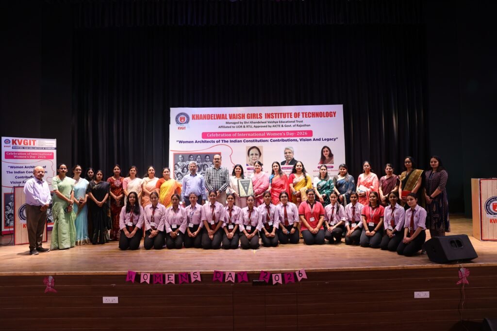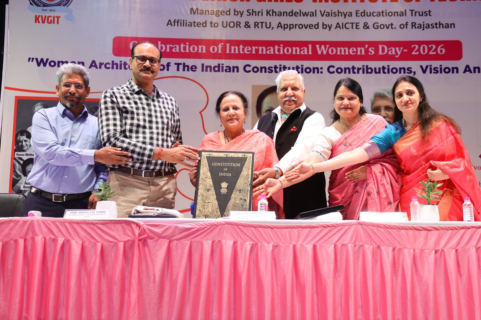 जयपुर, 7 मार्च। वैशाली नगर स्थित खण्डेलवाल वैश्य गर्ल्स इंस्टीट्यूटऑफ टेक्नोलॉजी (केवीजीआईटी) में अंतर्राष्ट्रीय महिला दिवस के उपलक्ष्य में शनिवार को आर.बी. डंगायच सभागार में सेमिनार का आयोजन किया गया।कार्यक्रम में मुख्य अतिथि प्रोफेसर निष्ठा जसवाल वाइस चांसलर डाॅ. अंबेडकर लाॅ यूनिवर्सिटी, प्रोफेसर डाॅ. परमजीत एस जसवाल वाइस चांसलर एसआरएम यूनिवर्सिटी, नोएडा, शिखा शर्मा एडवोकेट, सचिव सार्थक संवाद संस्थान, एसकेवीईटी के फाउंडर प्रेसीडेंट सोहनलाल तांबी, वर्तमान सचिव एम एल गुप्ता, महाविद्यालय प्राचार्य डाॅ. अंजु गुप्ता मौजूद रहे। कार्यक्रम की शुरुआत मां सरस्वती के चित्र के समक्ष दीप प्रज्वलित कर की गई। इसके बाद सभी अतिथियों का स्वागत किया गया। सेमिनार का विषय वूमेन आर्किटेक्ट्स ऑफ द इंडियन कांस्टीट्यूशन कंट्रीब्यूशन विजन एंड लिगसी रहा, जिसमें भारतीय संविधान के निर्माण में महिलाओं की महत्वपूर्ण भूमिका पर चर्चा की गई। मुख्य अतिथि प्रोफेसर निष्ठा जसवाल ने अपने संबोधन में कहा कि भारतीय संविधान केवल एक कानूनी दस्तावेज नहीं बल्कि समानता, न्याय और स्वतंत्रता के आदर्शों का प्रतीक है। उन्होंने बताया कि संविधान निर्माण में महिला सदस्यों ने सामाजिक न्याय, महिला अधिकारों और समान अवसरों के लिए महत्वपूर्ण दृष्टिकोण प्रस्तुत किया, जिनका प्रभाव आज भी भारतीय लोकतंत्र में दिखाई देता है। प्रोफेसर डॉ. परमजीत एस. जसवाल ने कहा कि संविधान सभा में शामिल महिलाओं ने दूरदर्शिता और दृढ़ संकल्प के साथ कार्य करते हुए देश के लोकतांत्रिक मूल्यों को मजबूत किया। उन्होंने छात्राओं को प्रेरित करते हुए कहा कि आज की युवा पीढ़ी को भी नेतृत्व और सामाजिक जिम्मेदारी के साथ राष्ट्र निर्माण में सक्रिय भूमिका निभानी चाहिए।कार्यक्रम में मौजूद शिखा शर्मा, एडवोकेट एवं सचिव सार्थक संवाद संस्थान जयपुर ने अपने वक्तव्य में कहा कि भारतीय संविधान ने महिलाओं को समान अधिकार प्रदान कर समाज में उनकी भागीदारी को सशक्त बनाया है। उन्होंने छात्राओं को अपने अधिकारों के प्रति जागरूक रहने और समाज में सकारात्मक बदलाव लाने के लिए आगे आने का संदेश दिया। इस मौके पर श्री सोहनलाल तांबी ने उपस्थित अतिथियों को केवीजीआईटी काॅलेज के विकास या़त्रा को साझा किया। वहीं श्री एम एल गुप्ता ने बताया कि छात्राओं को उच्च स्तरीय शिक्षा सुविधाएं दिलाई जा रही है। संस्थान की प्राचार्य डॉ. अंजु गुप्ता ने कहा कि अंतर्राष्ट्रीय महिला दिवस महिलाओं की उपलब्धियों, संघर्ष और समाज के विकास में उनके अमूल्य योगदान को सम्मान देने का महत्वपूर्ण अवसर है। उन्होंने कहा कि केवीजीआईटी संस्थान छात्राओं को गुणवत्तापूर्ण शिक्षा, आत्मनिर्भरता